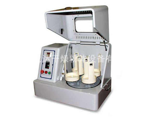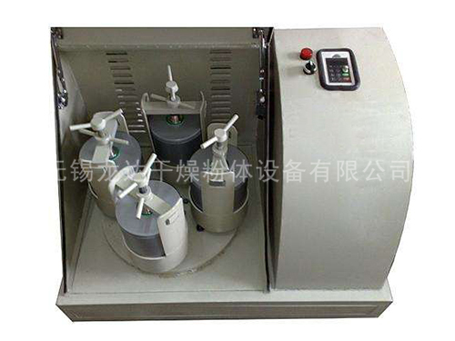 行星球磨機是在一轉盤上裝有四個球磨罐,當轉盤轉動時,球磨罐隨著轉盤轉動,同時球磨罐在齒輪的帶動下自身由中心軸帶動作行星運動,罐中磨球在高速運動中做不規則運動產生沖擊、剪切、研磨力達到研磨和混和樣品的目的。行星式球磨機能用干、濕兩種方法粉碎和混和粒度不同,材料各異的產品,效率高、效能大、研磨產品最小粒度可至0.1微米(即1.0×10-4mm)甚至納米級。