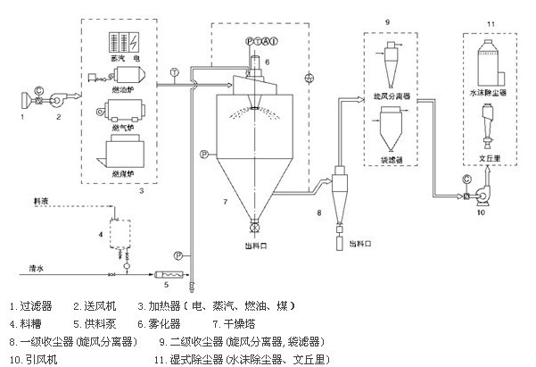 空氣通過過濾器和加熱器,進入干燥器頂部的空氣分配器,熱空氣呈螺旋狀均勻進入干燥器。料液由料液槽經過濾器由泵送至干燥器的離心霧化器,使料液噴成績效的霧狀液滴,料液和熱空氣并流接觸水分迅速蒸發,在極短時間內干燥為粉末狀成品。成品由于干燥塔地步和旋風分離器排除,廢棄由風機排出。